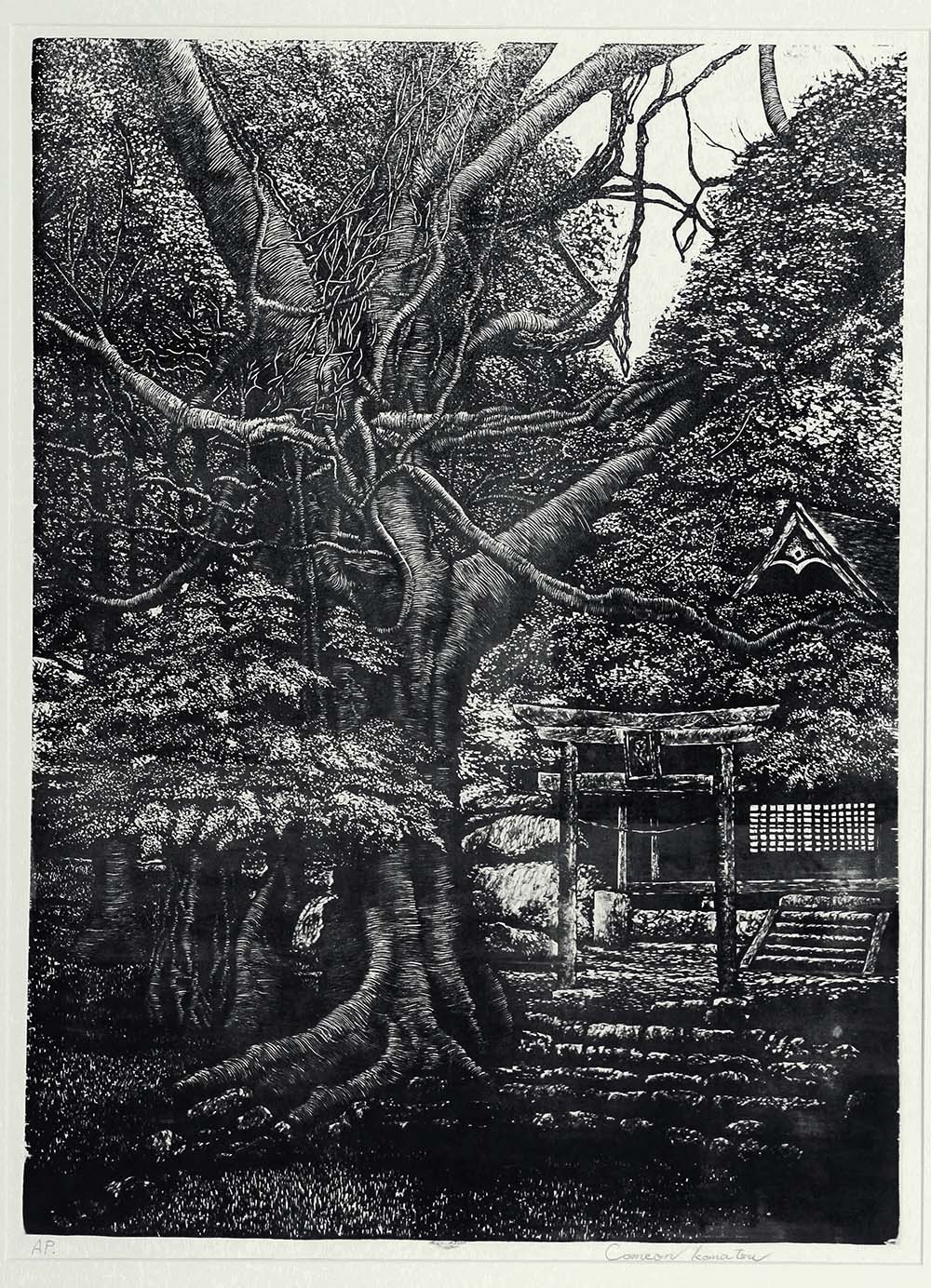 鳥居脇の、欅の木にさらに右側の藤のツタが絡まってまるでバリの木の様な複雑な様が魅力でした。作品の大きさの割には細かい彫りの技術が見せ場の作品に仕上がりました。