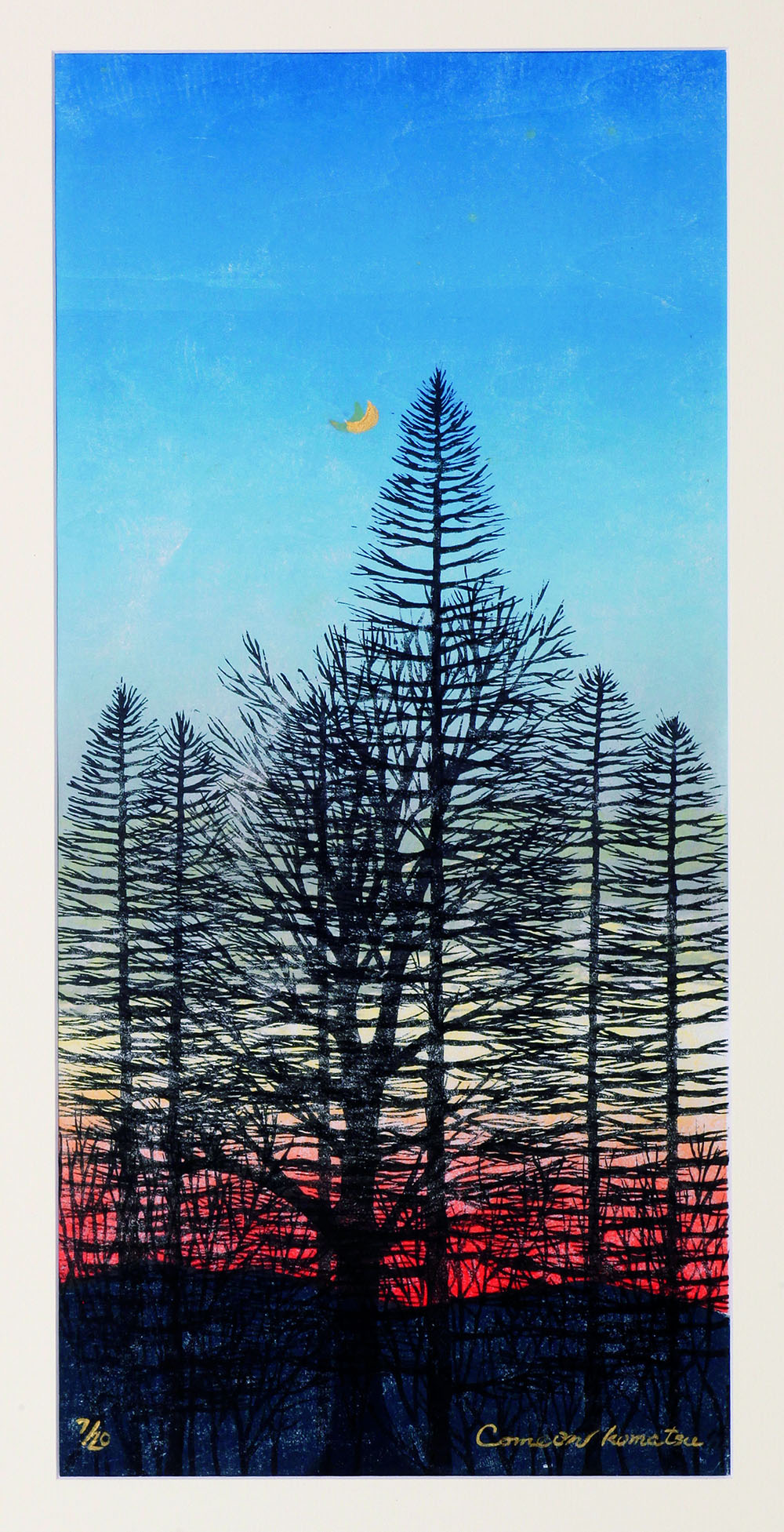 7版重ねています。色自体は空のグラデーションが2版、唐松のシルエットが2版、広葉街のシルエットが1版、山並み1版低木のが1版、と分解してあります。多色刷りを作るのは、絵の分解作業で、1つの版では絵になりません。彫っている作業中は結構退屈な彫りが続くので、あまり好んで作りたくは無いのです。