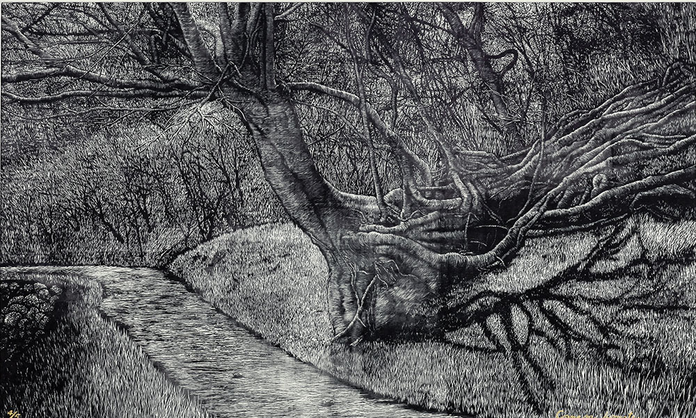 4月初め頃、山の木々が芽吹こうとして枝先がエンジ色に赤みがかった様子を、背景の山の部分にだけセピアを混ぜて刷ってみました。公募展に持っていった時、エンジ色を感じられたのですが、月日が経つと焼けて色味が抜けてしまった様です。